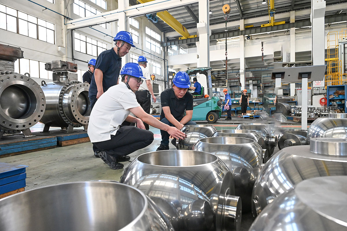 在焊接區域,考察團詳細察看了高標準的焊接工藝及無損檢測設備。伯特利嚴格遵循API、CE等國際認證標準,通過先進的焊接技術與質量控制體系,確保產品密封性能與結構強度達到行業領先水平。