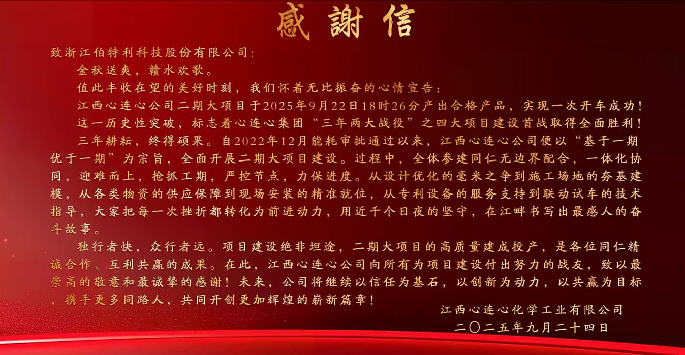 近日,浙江伯特利科技股份有限公司收到江西心連心化學工業有限公司(以下簡稱"心連心")發來的感謝信。信中,心連心對伯特利在二期大項目中提供的關鍵閥門產品表示高度認可,并特別感謝伯特利團隊在技術攻關、物資保障及現場協同中的卓越貢獻。